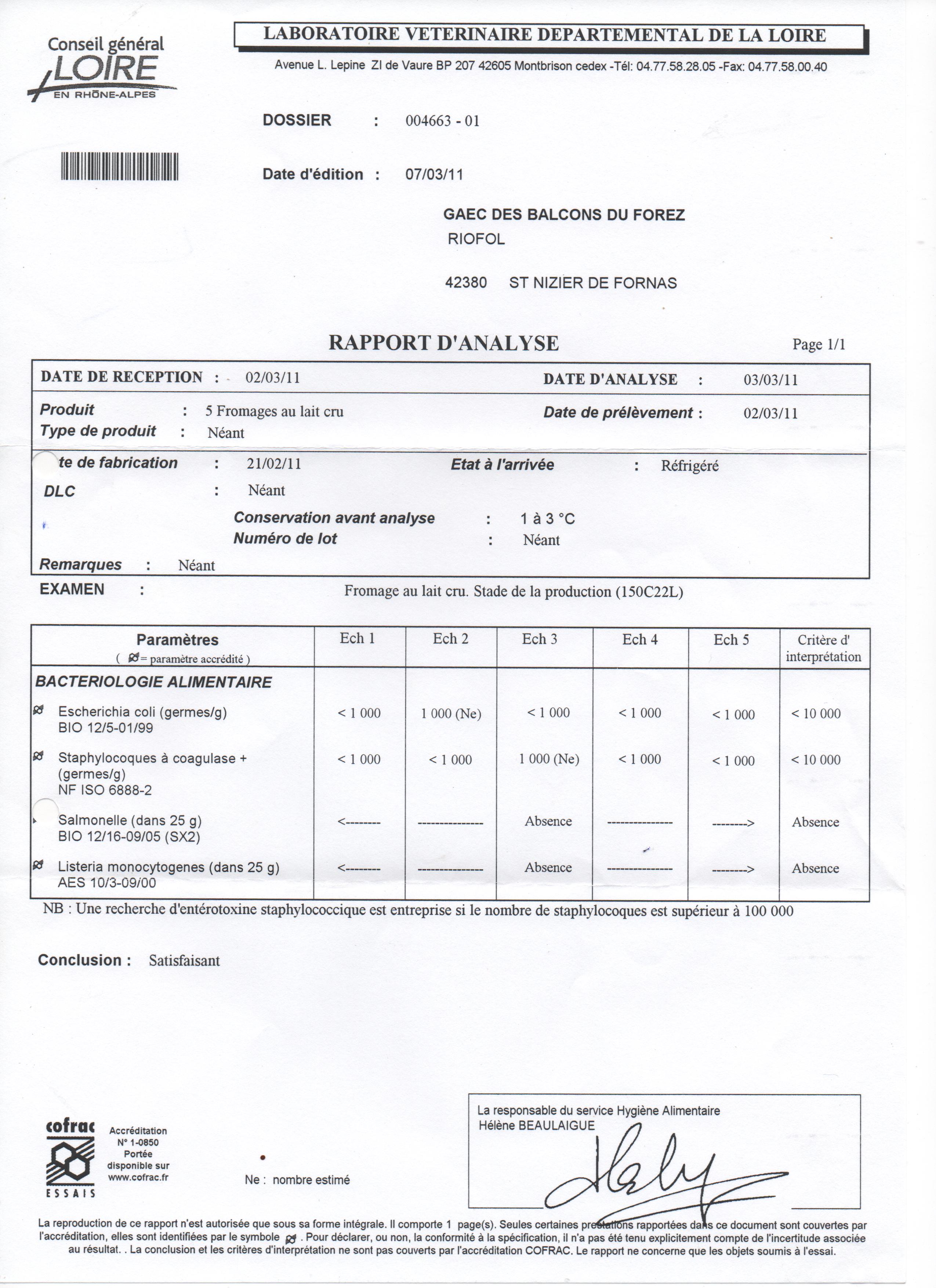 UN SUIVI SANITAIRE RIGOUREUXLa ferme et notamment la salle de traite, le matériel ainsi que le laboratoire de transformation, la salle de lavage, le magasin de vente et la remorque sur les marchés sont régulièrement contrôlés par la DDPP (Direction Départementale de la Protection des Personnes). Lors de la visite inopinée d'un agent, on doit être en mesure de présenter des résultats d'analyse sur les fromages. Cette analyse dite officielle s'effectue sur un échantillon de 5 fromages du même lot et quantifie 4 paramètres essentiels : les Escherichia coli, les staphylocoques, la salmonelle et la listéria. Pour les Escherichia coli et les staphylocoques, il y a une tolérance de leur présence (< 10 000 germes), en revanche pour la listéria et la salmonelle, leur présence est formellement interdite. En cas de mauvais résultat, un contact immédiat est effectué avec la DDPP qui dans le cas ultime peut suspendre l'activité de la fromagerie. Ces analyses permettent de rassurer autant le producteur que le consommateur sur la qualité d'hygiène et sanitaire du produit. |